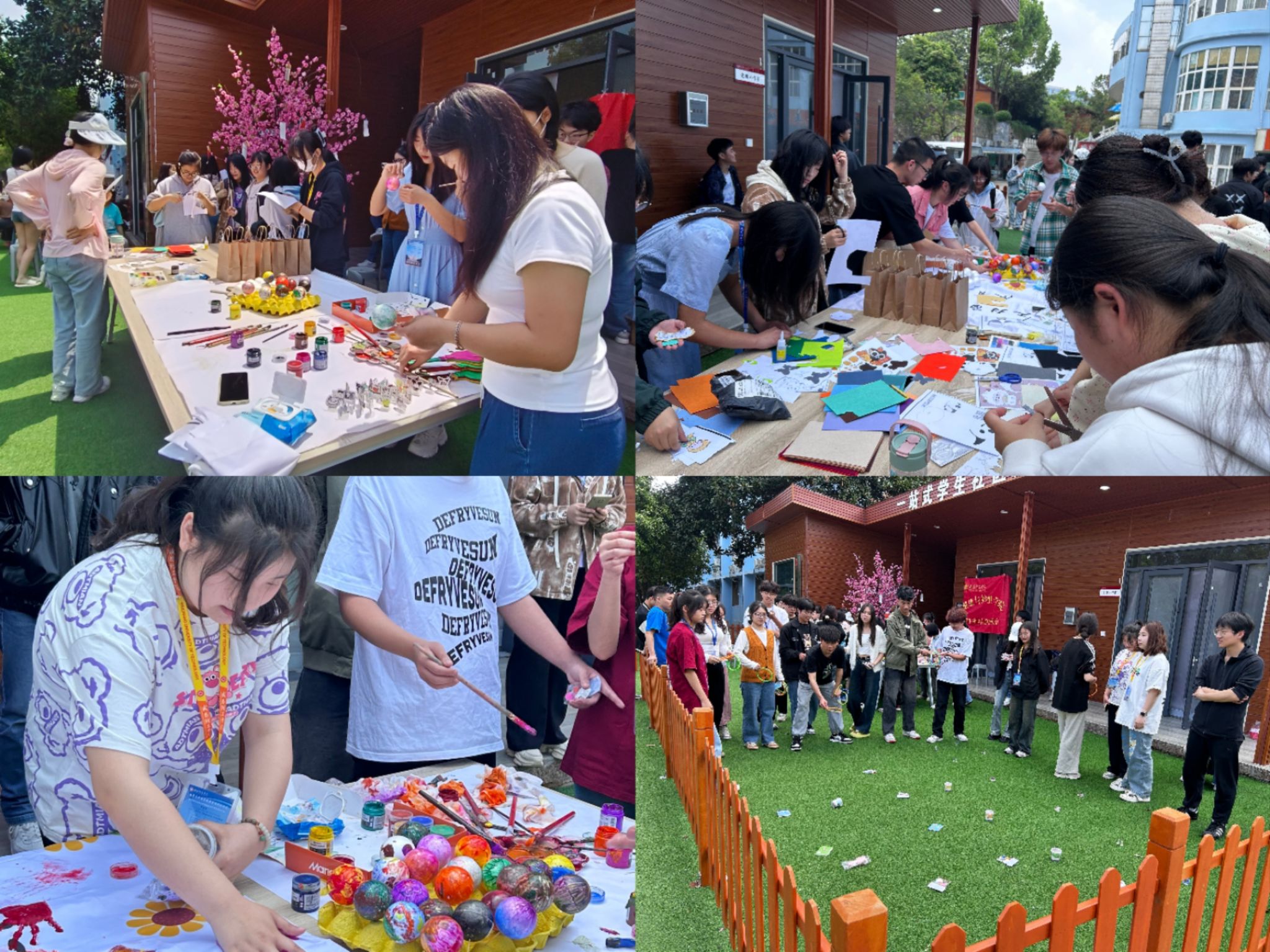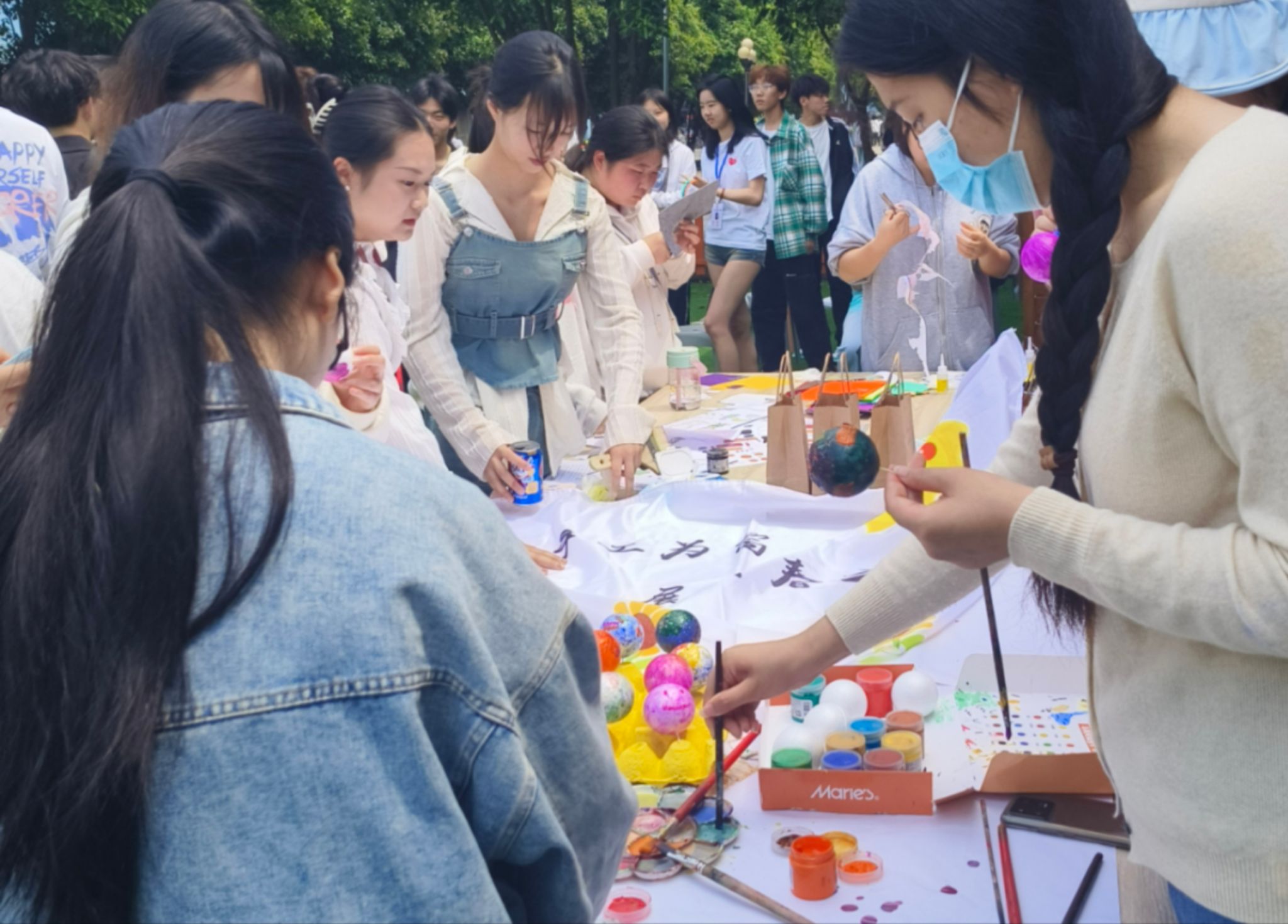 本次活动重点在于让大家以手工为中心,分别开展灵动剪纸、魔法星球、手印画和欢乐套圈多个活动,从多方面充分展现青春的多元魅力和创新精神,活动不仅挖掘学生的创造力,展现多样青春风采,而且通过学生实践操作,培养同学们动手能力。在灵动剪纸活动过程中,纸艺爱心协会指导同学们进行手工剪纸,大家都细致且充满创意的将纸片制作成了自己喜欢且独特的形状,感受到了剪纸的魅力;在魔法星球活动过程中,大家充分发挥想象,在泡沫小球上不断作画,每位同学用不同的颜色和图案赋予了小球独特的意义,都做出了属于自己的浪漫星球;以掌印为媒,永葆赤子之心,显青春之多彩,大家将自己的手掌涂上五彩斑斓的颜料然后印在了旗帜上,使白色的旗帜变得五颜六色,使其就像青春一样光彩夺目;在欢乐套圈游戏过程中,大家为了小礼物屏气凝神,全力以赴,每当成功套中礼物时都会引起一阵欢呼声,这将现场的气氛推入了那独属于童年欢快。