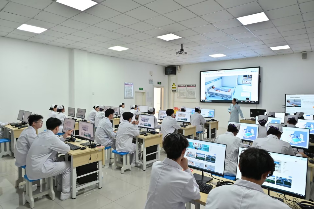 护理虚拟仿真实训室是护理虚拟仿真实训室是依托虚拟仿真技术与护理专业场景构建的沉浸式实训空间,核心价值是打破传统护理实训的场地、风险与耗材限制,实现 “安全实训、反复演练、精准评估” 的实训目标。实训室使用面积约160 m2,主要仪器由25套计算机,20套CPR模拟人,1套综合置管护理技能虚实结合训练平台,能同时容纳25人参与实验教学。主要承担《外科护理学》、《护理学基础实训》、《临床疾病概要》、《基础护理学实训》、《急危重症护理学》等课程的实训内容。