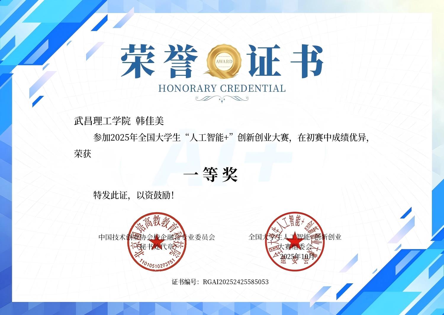 护理学2204班陈漫云同学在2025年全国大学生“人工智能+”创新创业大赛获得国家级一等奖