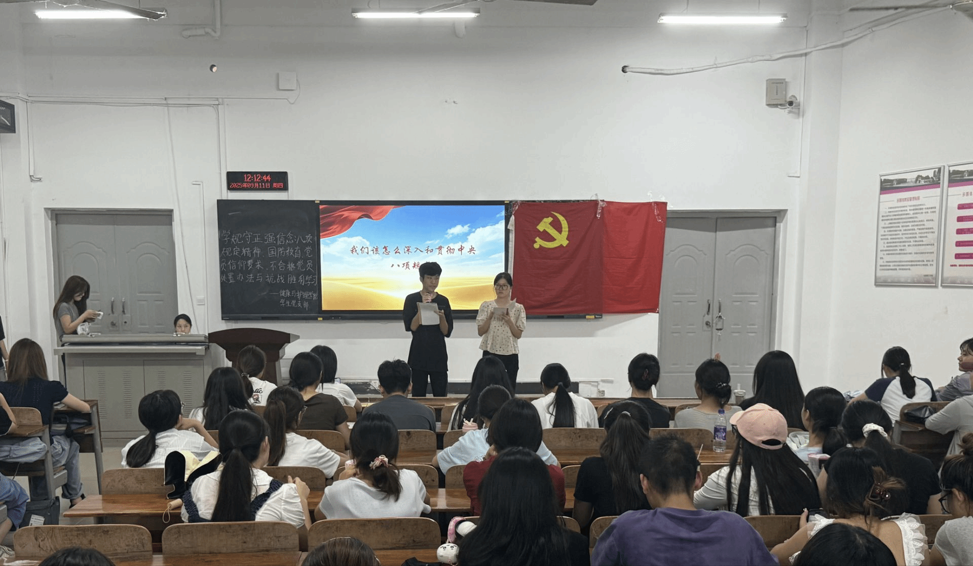 为强化党员理想信念,明确行为准则,武昌理工学院健康与护理学院学生党支部于2025年9月11日,在健康与护理学院101教室举办以“学规守正强信念:中央八项规定精神、国防教育、党员信仰要求、不合格党员处置办法与弘扬抗战精神”为主题的九月党日活动,旨在提升党员政治素养与责任意识,筑牢思想防线。