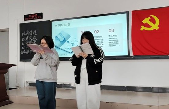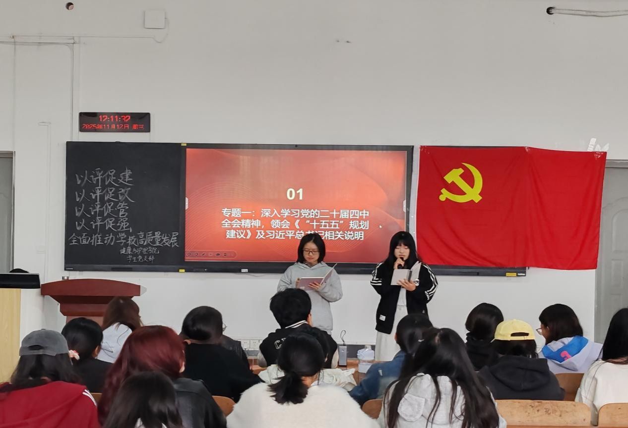 为深入学习贯彻党的重要精神,衔接学校本科教育教学审核评估工作,近日,健康与护理学院学生党支部以“以评促建、以评促改、以评促管、以评促强,全面推动学校高质量发展”为主题在护院101教室开展11月主题党日活动。活动由护理学2303班高子灵与护理学2303班秦文璟主持,全体在校积极分子与党员参会。