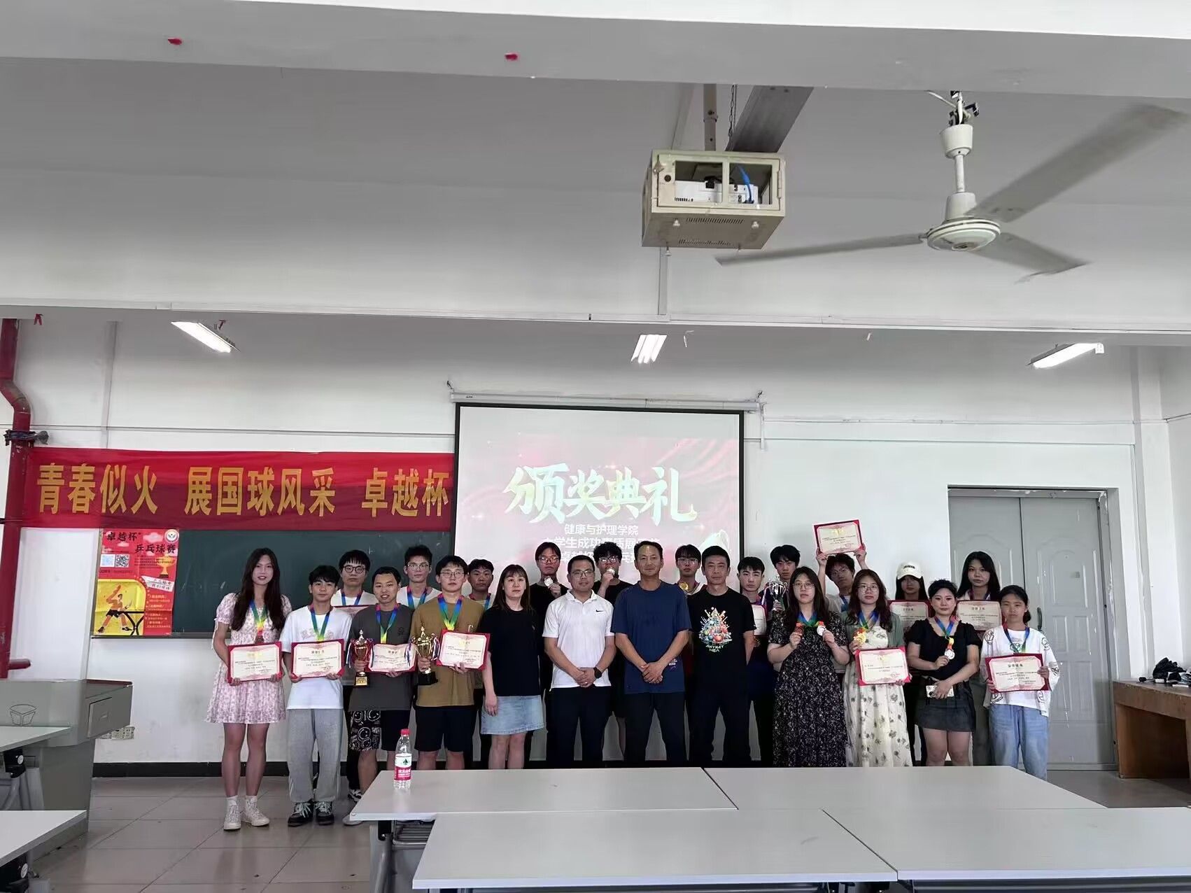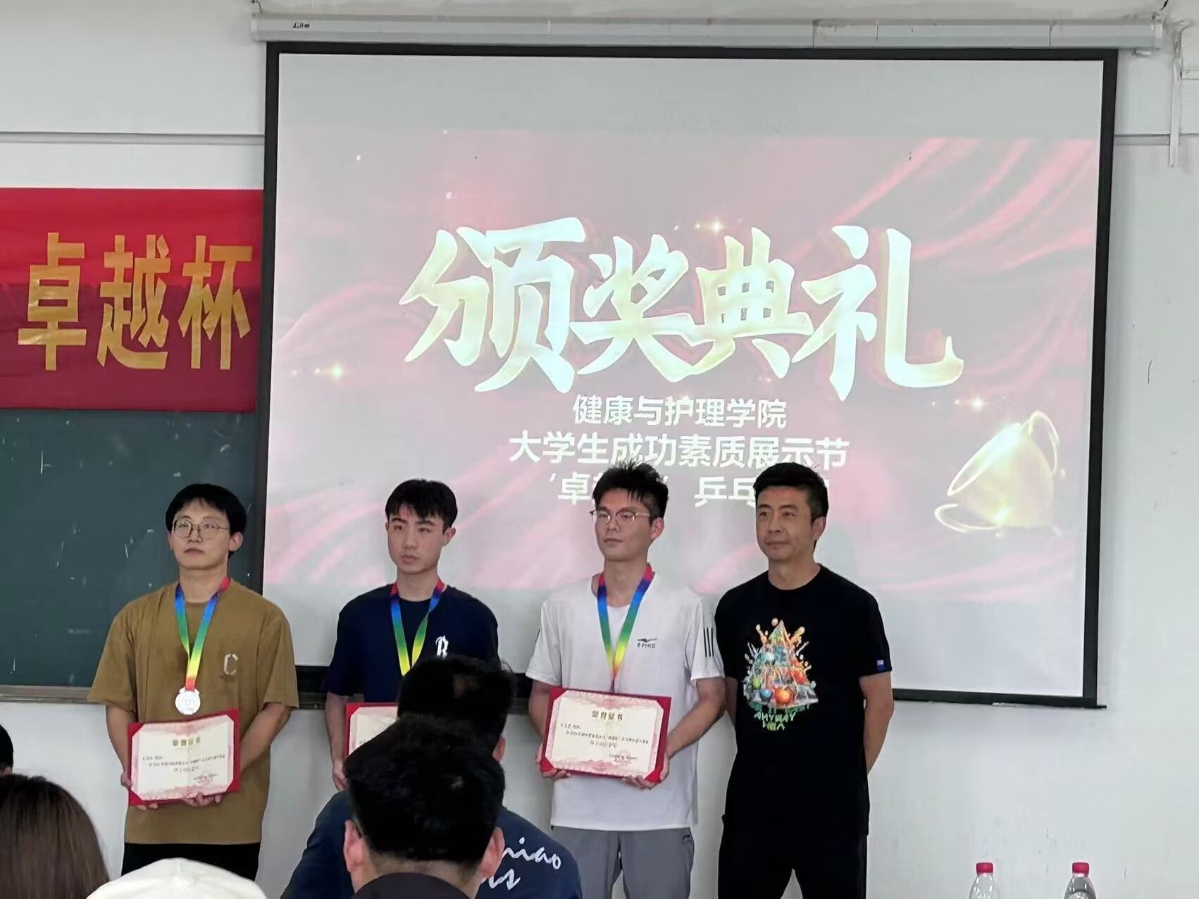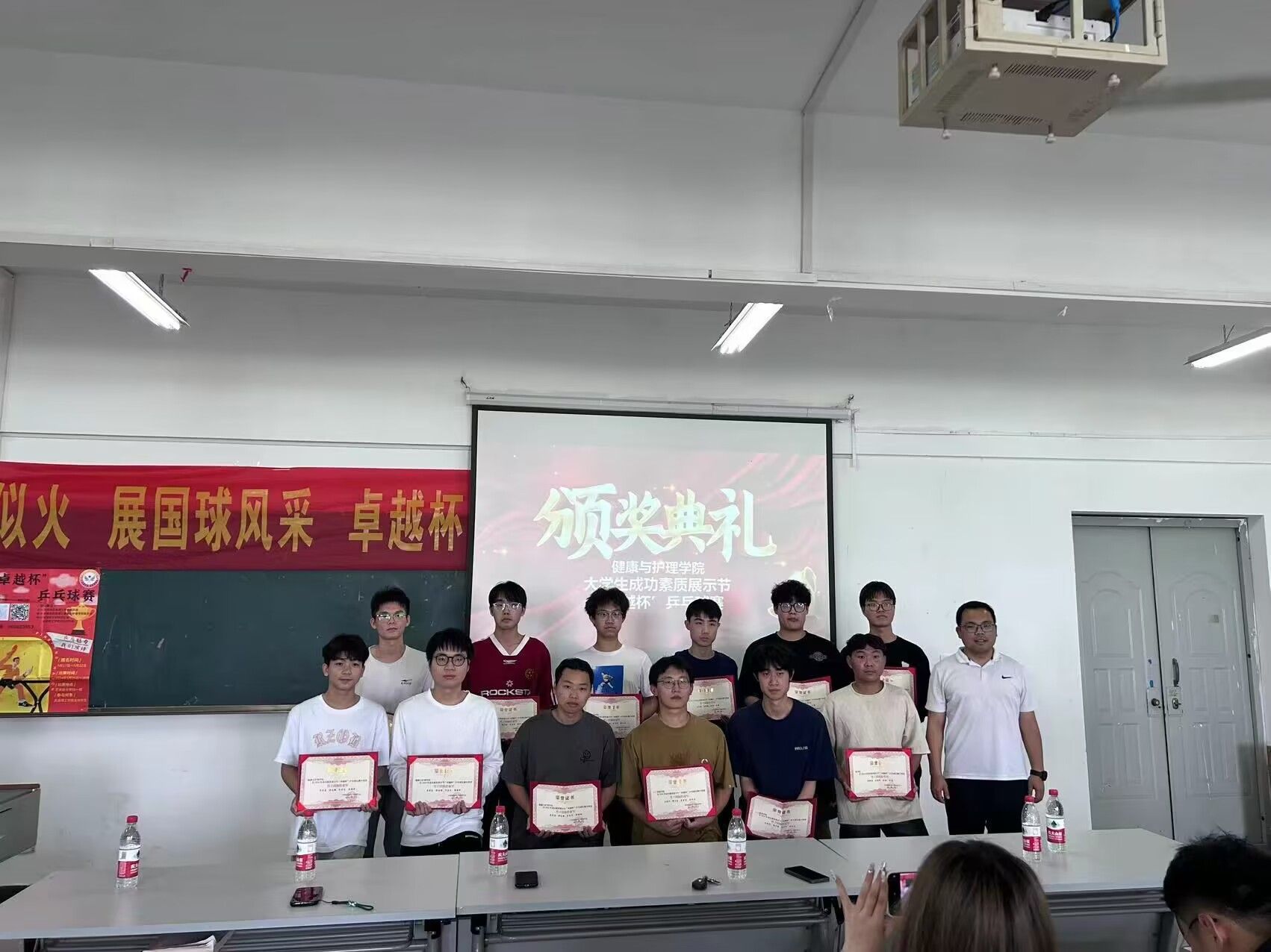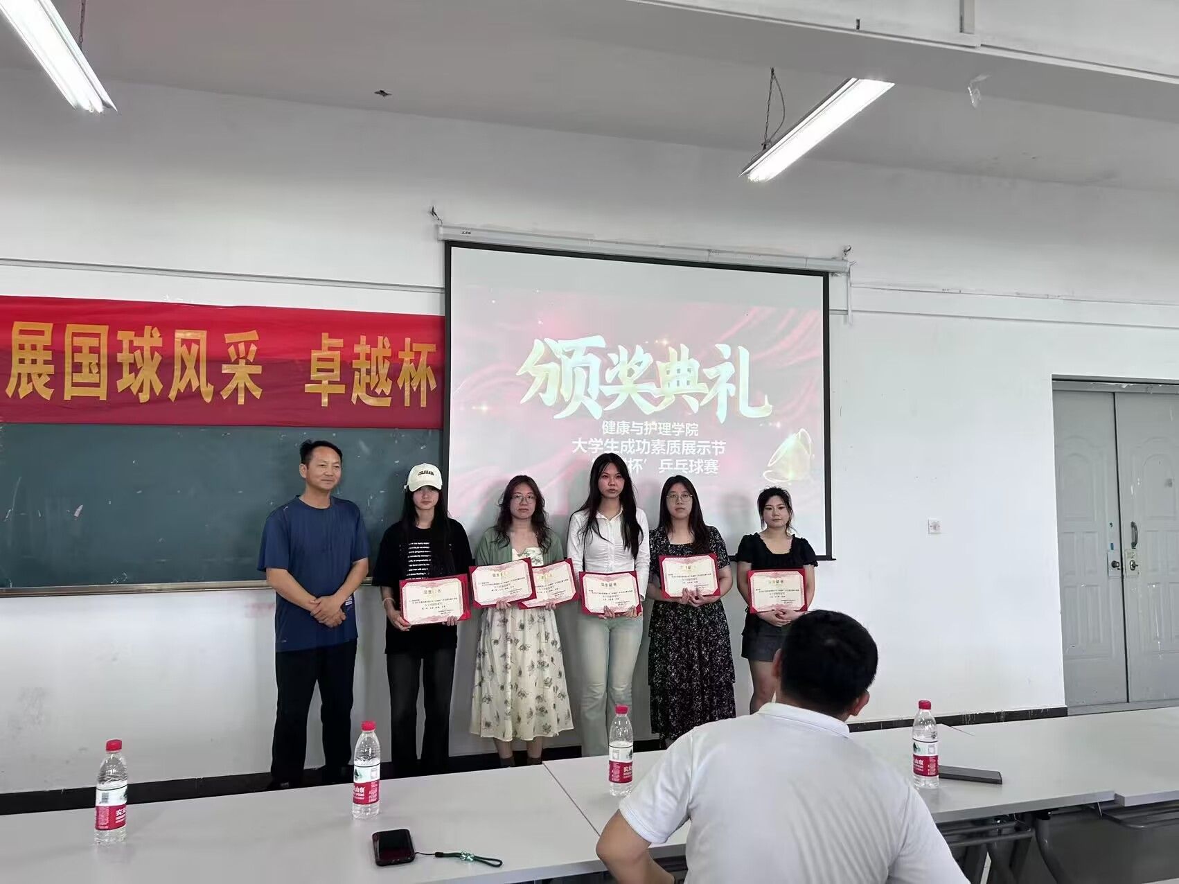 5月27日下午14:00在健康与护理学院501教室举行颁奖仪式,此次比赛邀请了校团委书记杨瑞、体育部主任王德平和张和峰为获奖同学和团体颁奖,其中,团体赛总积分第一名是人工智能学院;第二名是商学院;第三名是健康与护理学院。此次比赛为热爱乒乓球的同学们提供了一个相互交流、切磋球技的平台,还提供了一个展示自己,不断提高的机会。