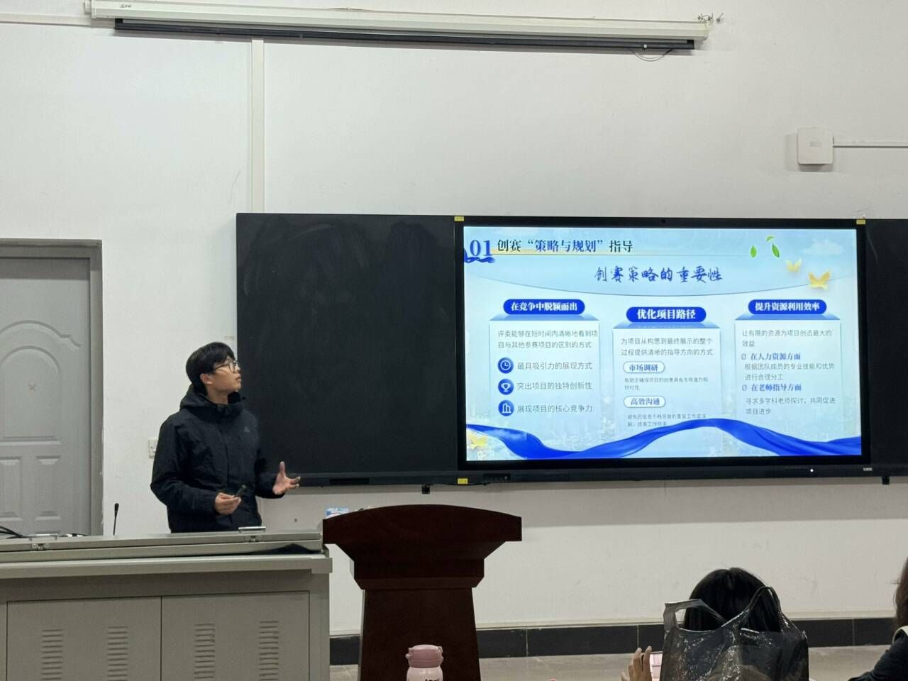 随后,人工智能学院智能2201班的张帅为同学们带来了关于项目实施过程中风险评估和应对策略的精彩分享。他结合自身的经验和知识,详细讲解了如何在创新创业过程中识别潜在风险,并给出了有效的应对策略。张帅的分享为同学们提供了宝贵的建议和指导,帮助他们更好地应对创新创业过程中的挑战。此外,他还分享了武昌理工学院在各类创新创业大赛中取得的优异成绩,展示了学生们的创新能力和创业潜力。活动中,还介绍了多个表现突出的团队和项目,如“锦瑟华年非遗珠宝定制”团队和“启智乐享”团队,他们的创意和实践能力得到了充分展现。