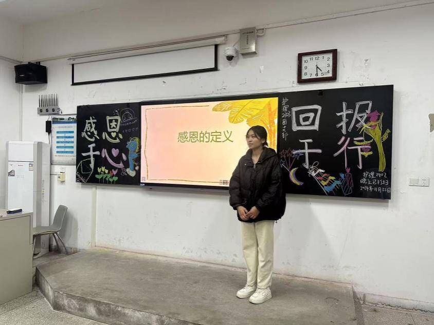 本次活动由护理2303班的学习委员聂文雯精心主持。她深入剖析了感恩的深远意义,指出感恩既是传统美德,也是我们应当坚持的生活哲学。她强调,首要感恩的是父母,他们赐予我们生命,历尽艰辛将我们养育成人,用无尽的爱为我们搭建起温馨的避风港。同时,老师也值得我们深深感激,他们在知识领域为我们引路,于迷茫时刻耐心指导,于犯错之时悉心教诲,引领我们回归正道。此外,朋友同样不可或缺,他们陪伴我们走过孤独,于困境中伸出援手,与我们共欢乐、同患难。感恩应体现在日常行为中,如温暖的微笑、贴心的问候、真诚的帮助等。让我们把感恩融入生活,养成感恩的习惯,以感恩之心善待他人,携手共创一个因感恩而愈发美好的世界。