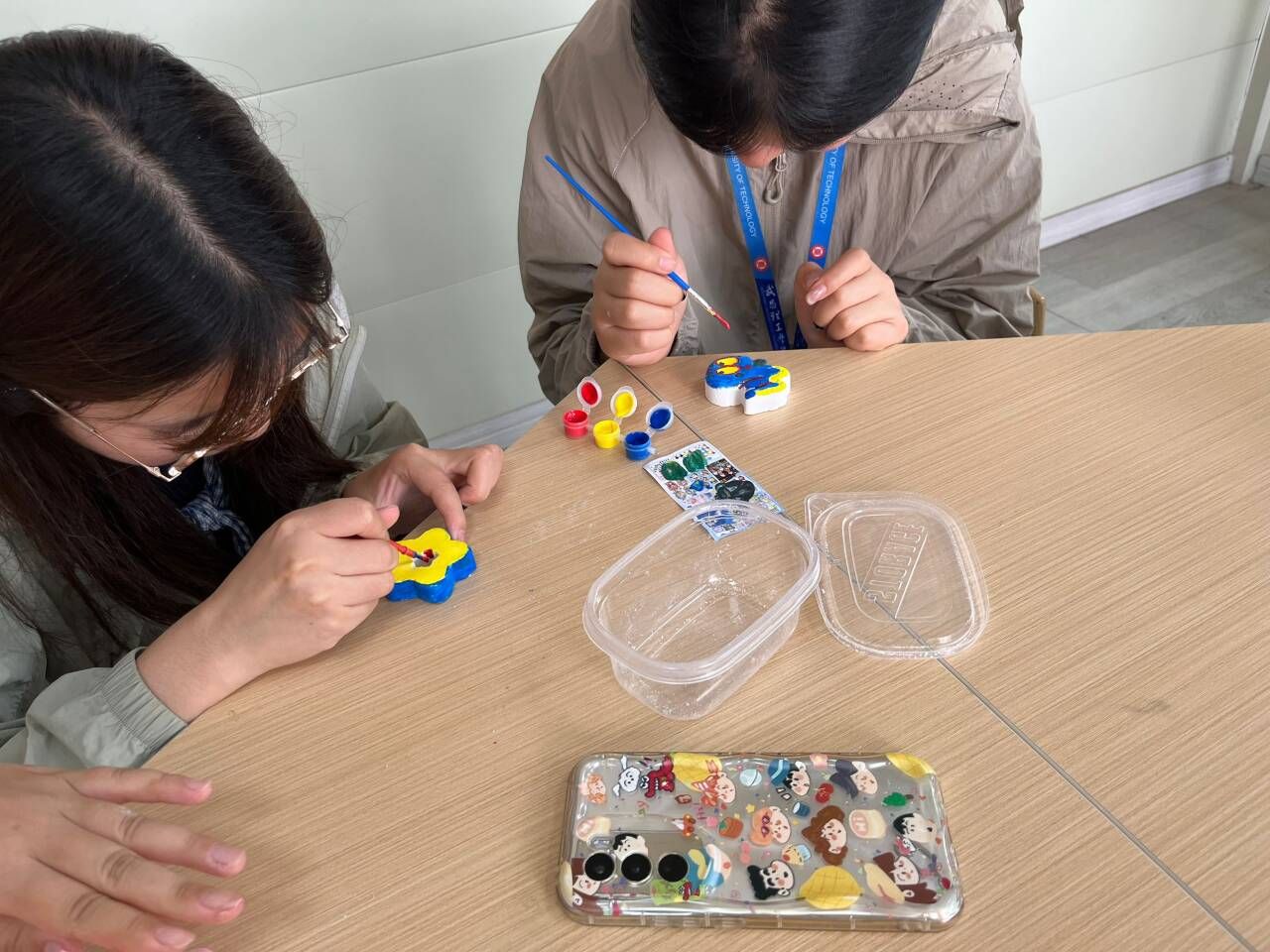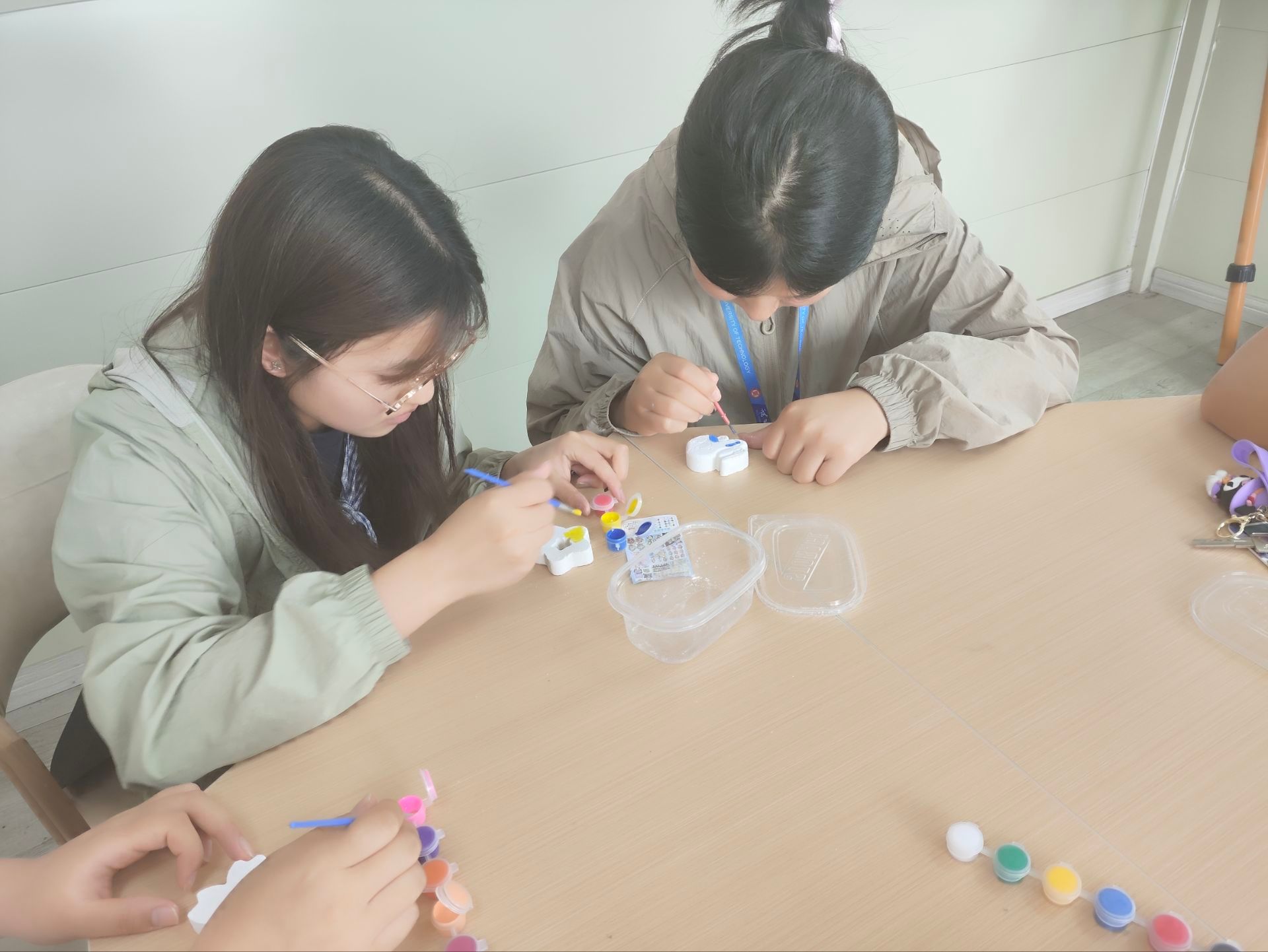 活动开始前,桌子上就摆着琳琅满目的石膏娃娃供同学们自己挑选。在创作区的同学们神情专注,调色、上色,动作娴熟而认真。有的同学笔下的石膏娃娃身着绚丽多彩的服饰,仿佛从童话中走来;有的则以简约清新的色调,赋予石膏娃娃别样的文艺气质。在创作过程中,同学们不时交流讨论,分享绘画技巧与创意灵感,现场氛围热烈而融洽。