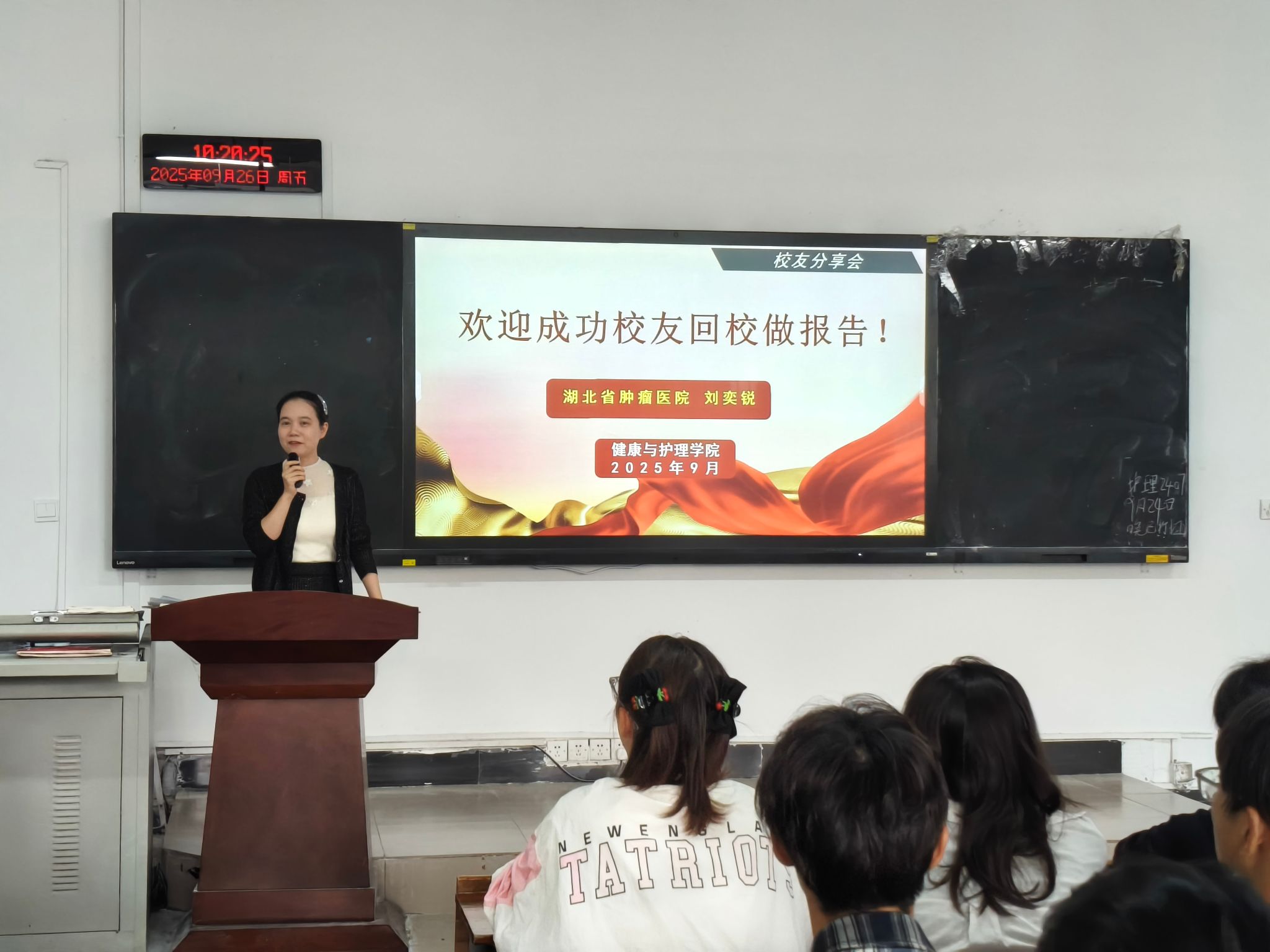 (通讯员 董怡雪 杨鸿铭 报道 熊梦宇 陈慧玲 彭雅泽 摄影)为充分发挥杰出校友的榜样引领效能,助力在校学子明晰职业发展路径、树立行业发展信心,2025年9月26日,武昌理工学院健康与护理学院特邀湖北省肿瘤医院护理领域精英、优秀校友刘奕锐荣归母校,为学院师生呈现了一场兼具专业深度与人文温度的职业发展分享盛会。