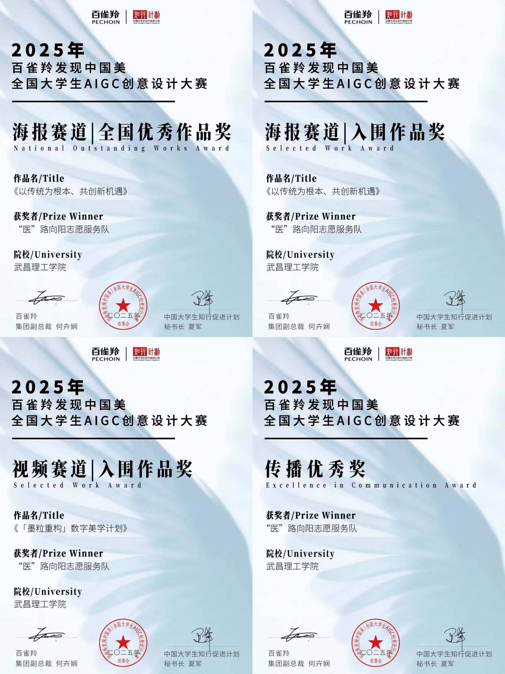 (通讯员 董怡雪 报道)近日,2025年百雀羚“发现中国美”全国大学生AIGC创意设计大赛圆满落幕,武昌理工学院“医”路向阳志愿服务队凭借出色的创意设计和扎实的实践成果,在众多参赛队伍中脱颖而出,荣获多项大奖,充分展示了该校学生在创意设计领域的卓越才能和志愿服务精神。