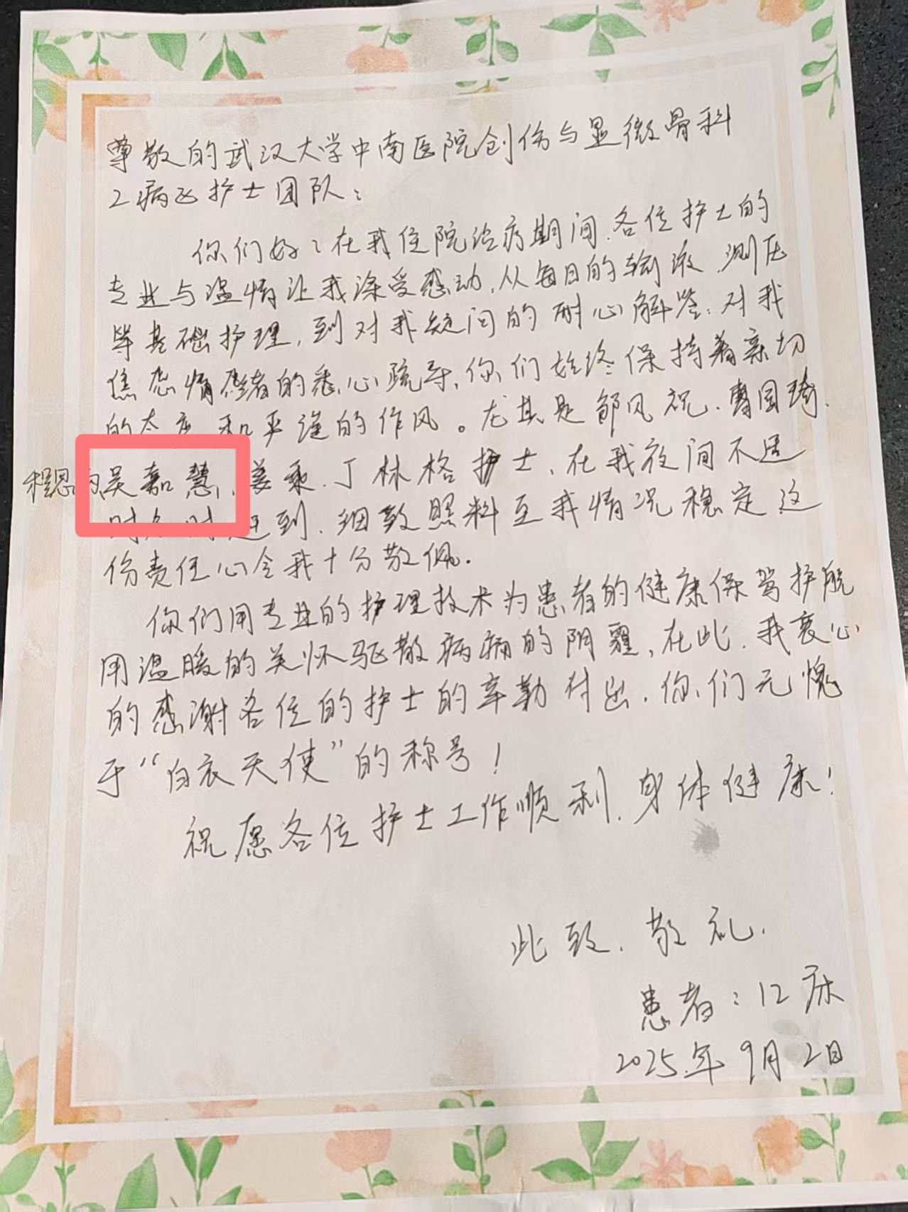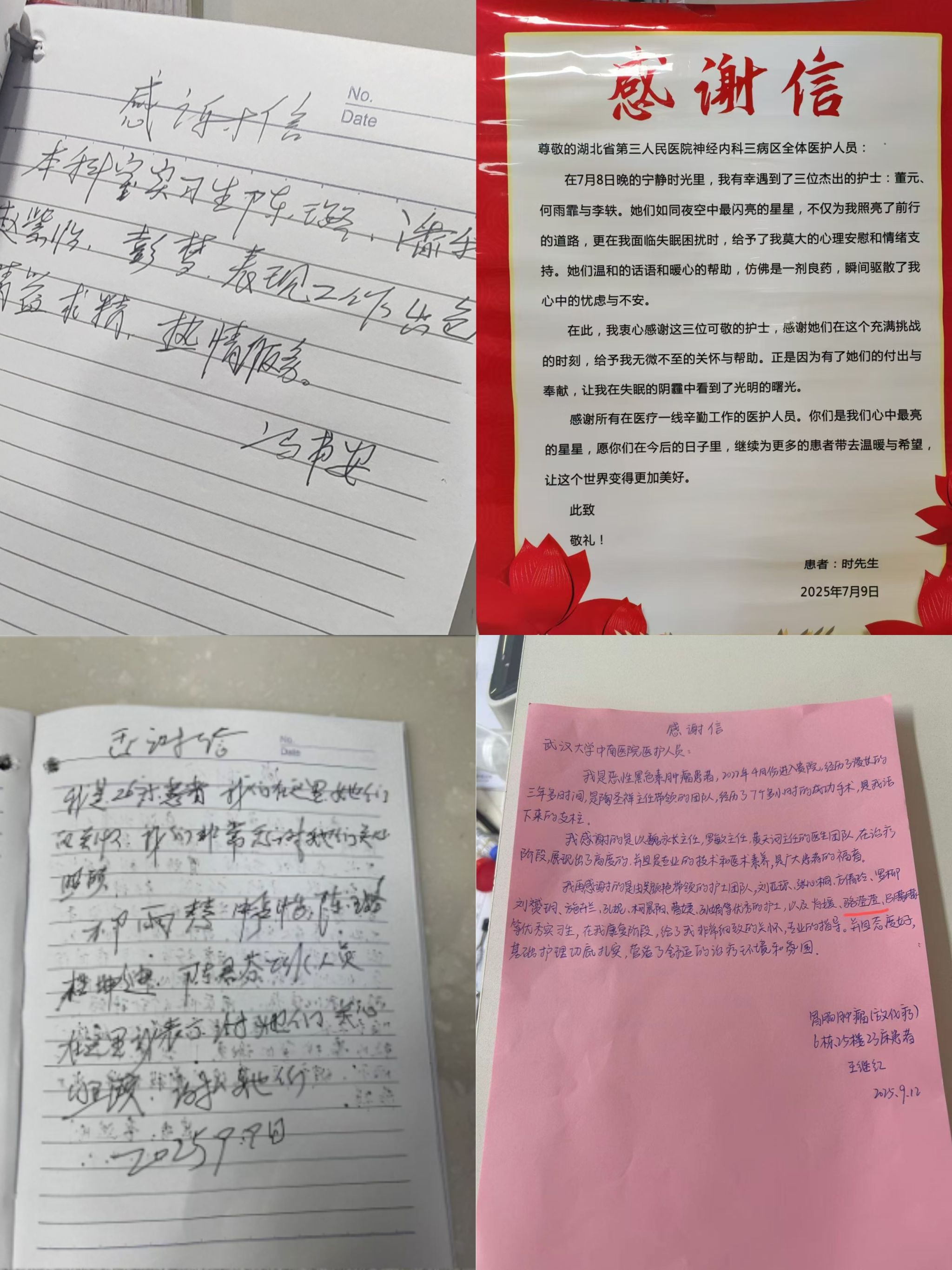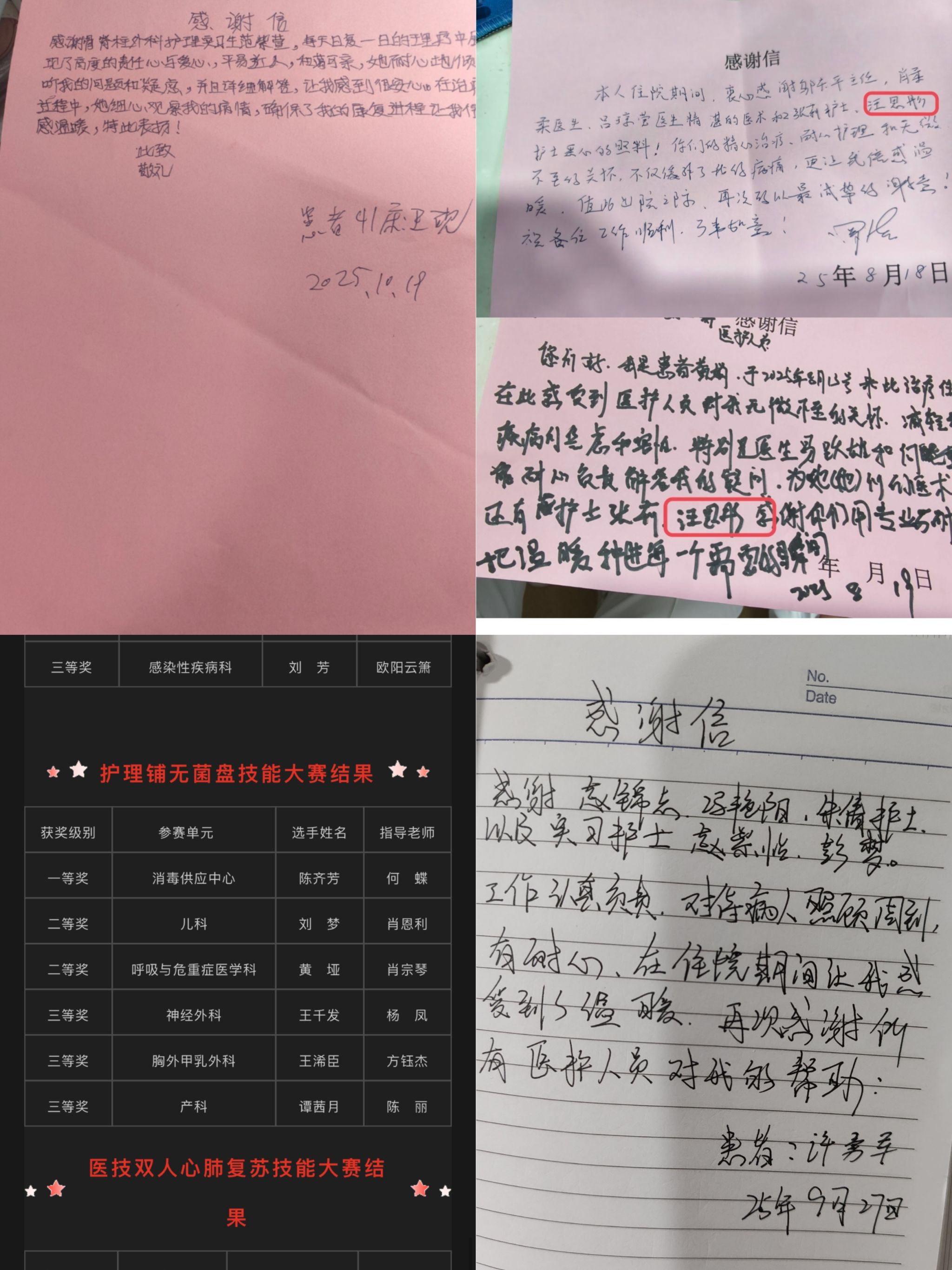 护理 2305 班的彭梦同学在武汉人民医院血管外科和中医科轮转时,护理工作认真负责、热情周到,展现出救死扶伤的大爱情怀。杜坤迪同学在武汉人民医院胃肠外科实习,以良好的态度、耐心仔细的工作作风,赢得患者的肯定。陈君芬同学在武汉人民医院胃肠外科和心内科一病区实习,护理态度亲和,工作认真细致,深受患者好评。李轶同学在湖北省第三人民医院神经内科实习时,在入职第一天就积极关注患者需求,为患者协调床位,用实际行动诠释了关怀与责任。范紫萱同学在武汉第一医院骨脊柱外科病区实习,给予患者心理安慰,耐心解答疑惑,在理疗期间贴心护理,让患者身心得到极大慰藉。汪思彤同学在武汉大学中南医院妇科实习,工作认真负责,护理操作技能娴熟,态度亲切和蔼,获得患者的认可。