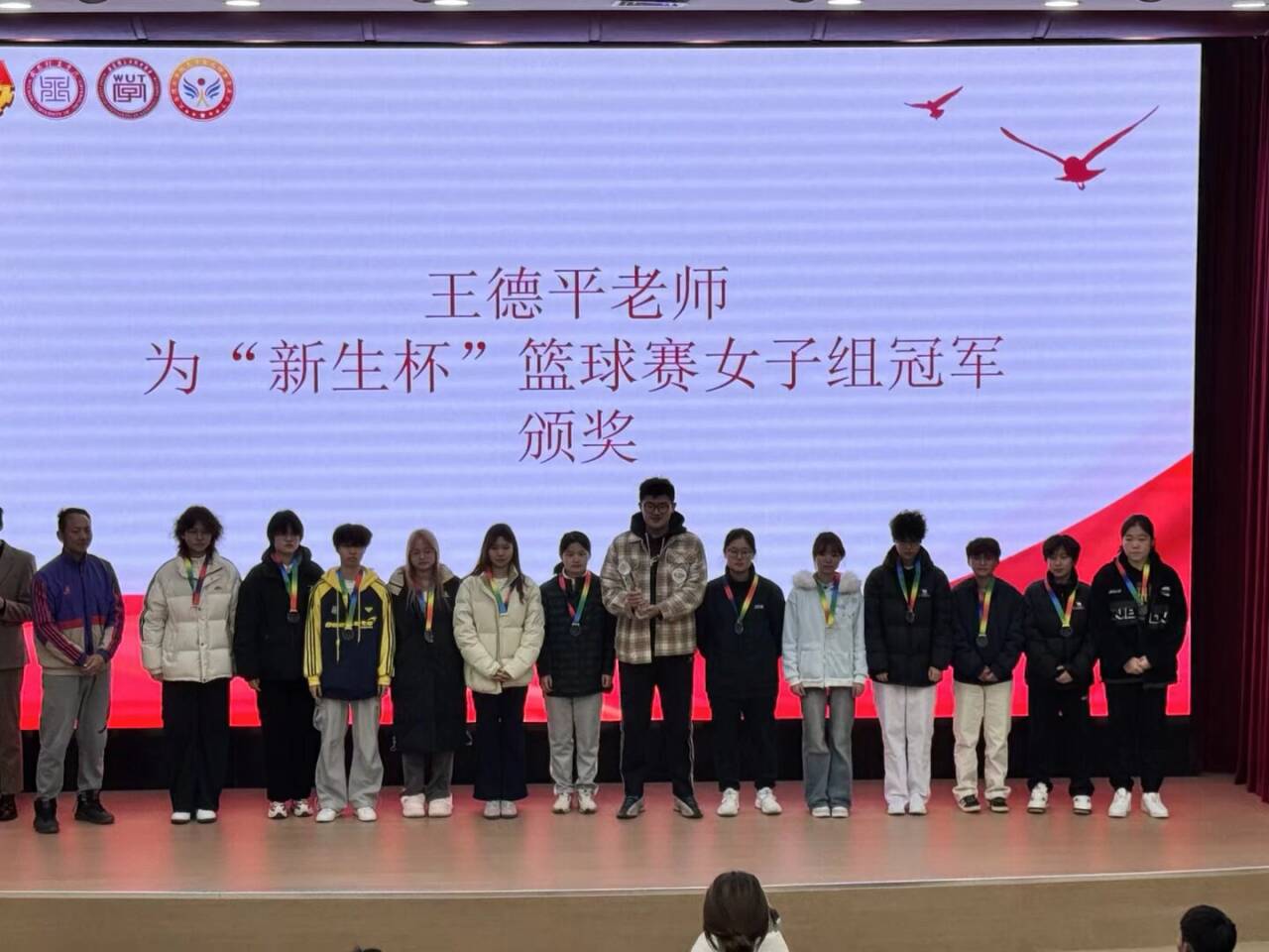 颁奖仪式现场,王德平老师和刘开群老师分别为获奖队伍及个人颁发荣誉证书与奖杯。健康与护理学院获奖球员精神抖擞地走上领奖台,接过这份凝聚着汗水与努力的荣誉。健康与护理学院体育部工作人员提前完成参与人数统计上报,全程有序组织,保障了学院获奖代表顺利参与颁奖仪式。