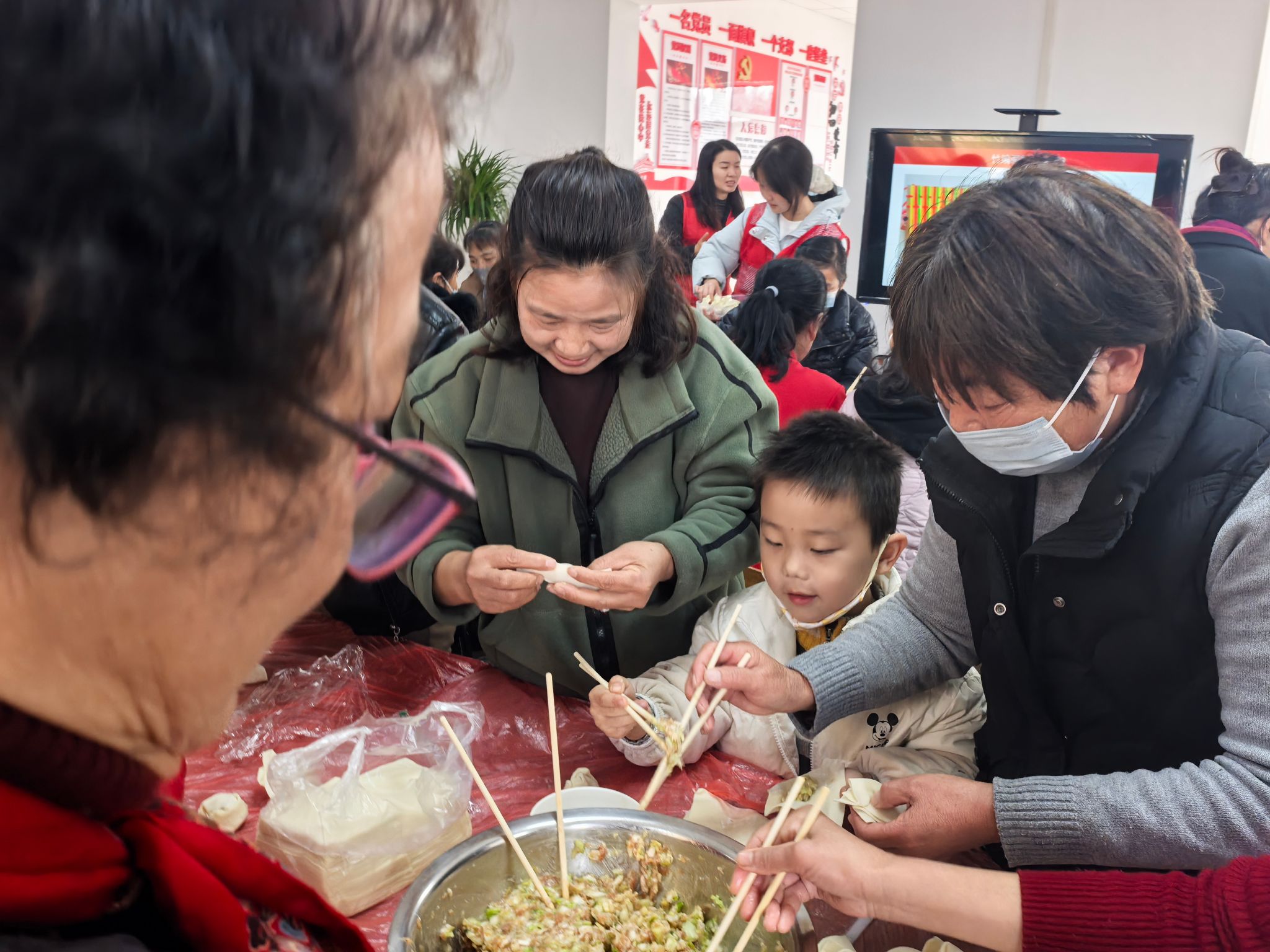 随着活动正式启动,志愿者们迅速投入忙碌而有序的行动中。清洁组的志愿者们手持扫帚、夹子、垃圾袋等工具,兵分多路奔赴社区各个角落。他们不放过路面的烟头纸屑,仔细清理绿化带里的枯枝败叶,认真擦拭公共设施上的灰尘污渍,用汗水擦亮社区的“颜值”。与此同时,包饺子组的志愿者们也进入指定场地,在纪律维护组的引导下分工协作,择菜、调馅、擀皮、包饺子,各个环节有条不紊。有的志愿者手法娴熟,捏出的饺子圆润饱满、造型精致。有的志愿者是初次尝试,在同伴的指导下慢慢摸索,虽然包出的饺子形态各异,却满含心意。纪律维护组全程在岗监督,提醒大家按需取用食材,杜绝浪费现象。引导志愿者保持手部和操作台的整洁卫生,避免交叉污染。及时疏导人流,防止出现拥挤喧哗的情况。现场欢声笑语不断,一只只热气腾腾的饺子摆满托盘,氤氲的香气里满是温情。
